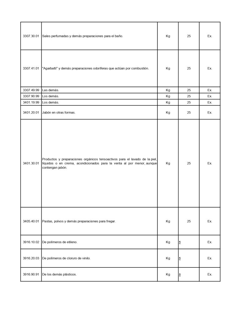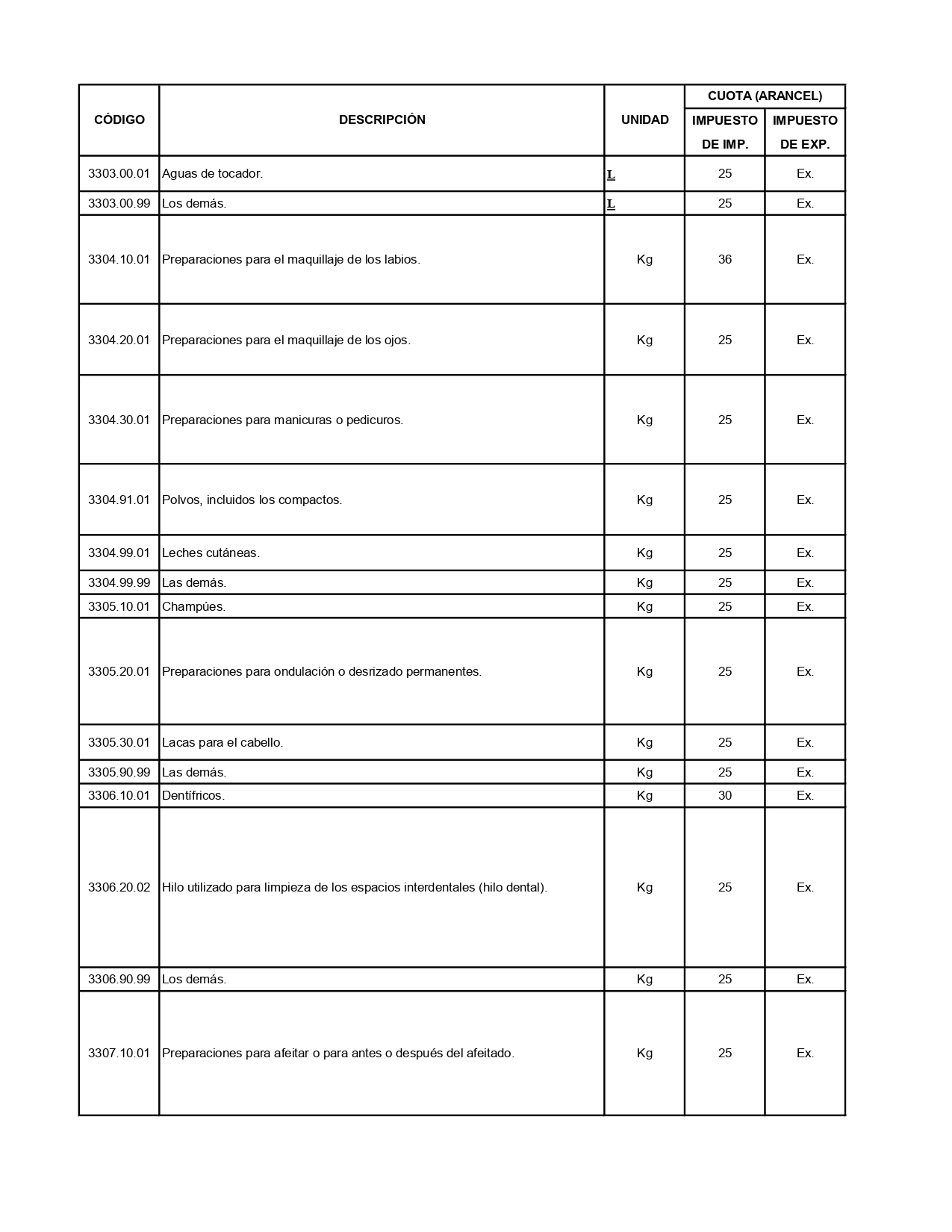 En este contexto, el Artículo Único del Decreto contempla la modificación de las cuotas de importación aplicables a diversas fracciones arancelarias correspondientes principalmente a productos de perfumería, cosméticos y preparaciones para el cuidado personal, cuyas fracciones quedan sujetas a cuotas que oscilan entre el 25 %, 30 % y 36 %, manteniéndose exentas del impuesto de exportación, como se muestra a continuación: