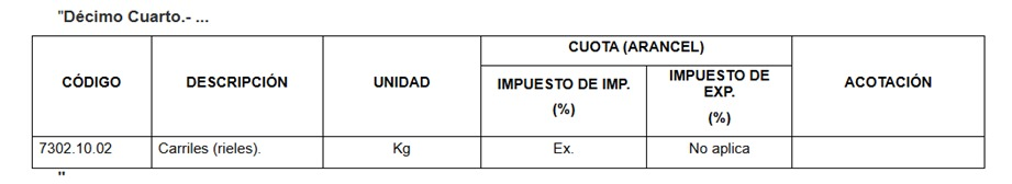 Finalmente, se justifica la necesidad de establecer un arancel-cupo como un mecanismo para garantizar el abasto oportuno de dichos insumos estratégicos, prevenir afectaciones en su disponibilidad y proteger el poder adquisitivo de la población. La medida cuenta con la opinión favorable de la Comisión de Comercio Exterior y se formaliza mediante la adición de la fracción arancelaria 7302.10.02 al artículo Décimo Cuarto del Decreto referido, consolidando así un instrumento de política comercial orientado al desarrollo económico y la estabilidad del mercado interno.
