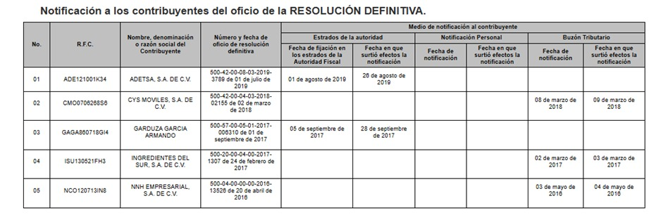 La Administración Central de Fiscalización Estratégica del Servicio de Administración Tributaria (SAT), con fundamento en la Constitución Política de los Estados Unidos Mexicanos, la Ley del Servicio de Administración Tributaria, el Reglamento Interior del SAT y los artículos 33, 63 y 69-B del Código Fiscal de la Federación, informa que diversos contribuyentes fueron notificados con oficios de presunción de inexistencia de operaciones respecto de comprobantes fiscales emitidos, conforme al procedimiento previsto en el artículo 69-B del Código Fiscal de la Federación vigente hasta el 24 de julio de 2018. Posteriormente, tras la interposición de medios de defensa, se determinó dejar sin efectos el procedimiento, al haberse obtenido una resolución favorable para dichos contribuyentes. No obstante, lo anterior no los exime de responsabilidad respecto de otros comprobantes fiscales que pudieran haber emitido sin contar con activos, personal, infraestructura o capacidad material, por lo que se mantienen a salvo las facultades de comprobación de la autoridad fiscal.
