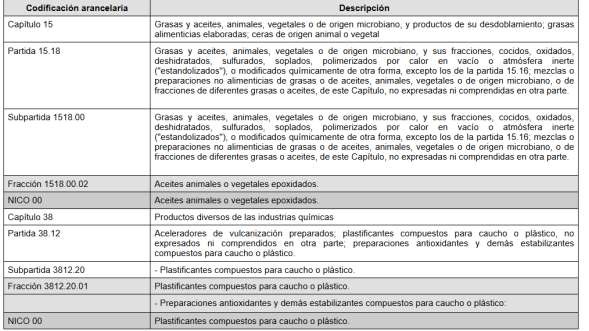 Decreto por el que se expide la Ley de los Impuestos Generales de Importación y de Exportación (LIGIE 2022) y al Acuerdo NICO 2022, lo ubica en las fracciones arancelarias 1518.00.02 NICO 00 y 3812.20.01 NICO 00 de la Tarifa de la LIGIE.