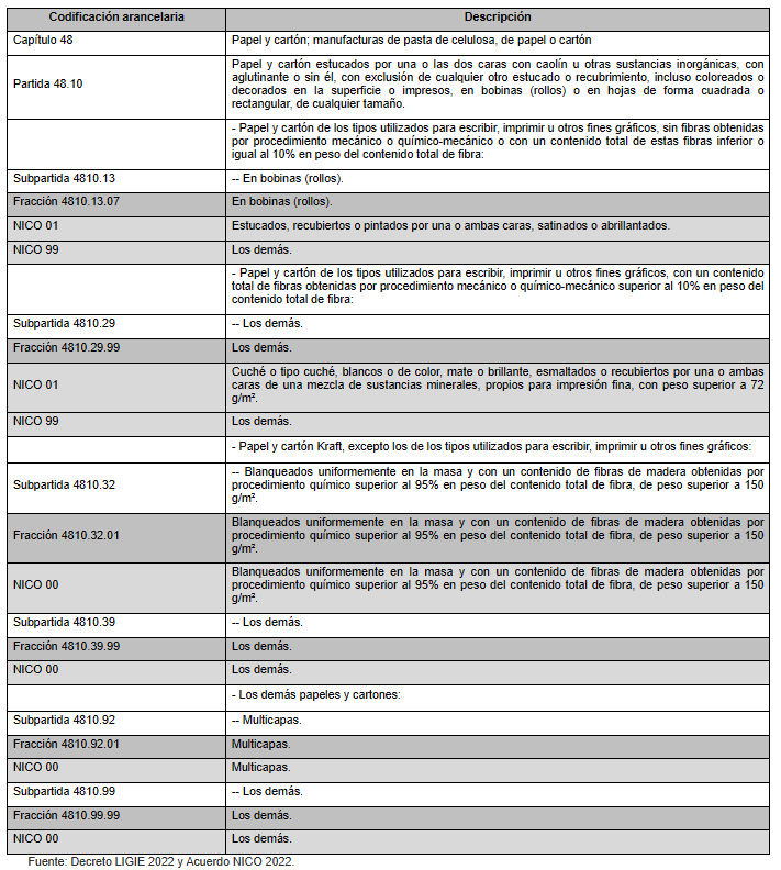 De acuerdo con el Decreto por el que se expide la Ley de los Impuestos Generales de Importación y de Exportación (LIGIE 2022) y el Acuerdo NICO 2022, el cartoncillo se clasifica principalmente en las fracciones arancelarias 4810.13.07, 4810.29.99, 4810.32.01, 4810.39.99, 4810.92.01 y 4810.99.99. Conforme al Decreto TIGIE 2024, publicado el 22 de abril de 2024, las importaciones bajo dichas fracciones están sujetas a aranceles temporales del 20% y 25%, con vigencia de dos años, salvo cuando las mercancías provengan de países con tratados comerciales vigentes con México.
